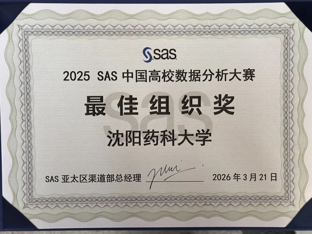 2026年3月21日,2025 SAS中国高校数据分析大赛总决赛在苏州圆满落幕。在本次比赛中,我院共有2支队伍进入全国总决赛,与来自北京大学、上海交通大学、西安交通大学、浙江大学等高校的76支队伍同台竞技。经过激烈角逐,我院参赛队伍最终荣获全国一等奖1项、全国二等奖1项,沈阳药科大学荣获“最佳组织奖”。