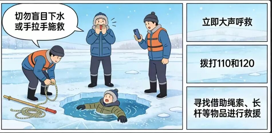 如果要参与冰上活动,请务必选择有安全管理的正规场所。同时,请了解安全常识:若发现他人落水,切勿盲目下水或手拉手施救,应立即大声呼救、拨打110和120,并寻找借助绳索、长杆等物品进行救援。安全无小事,防范于未然,过一个平安的假期。