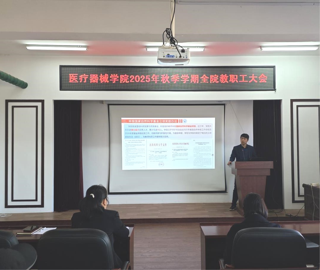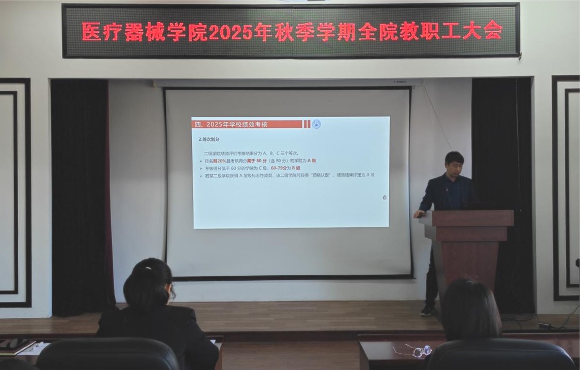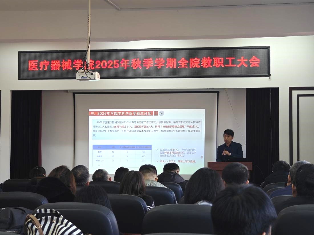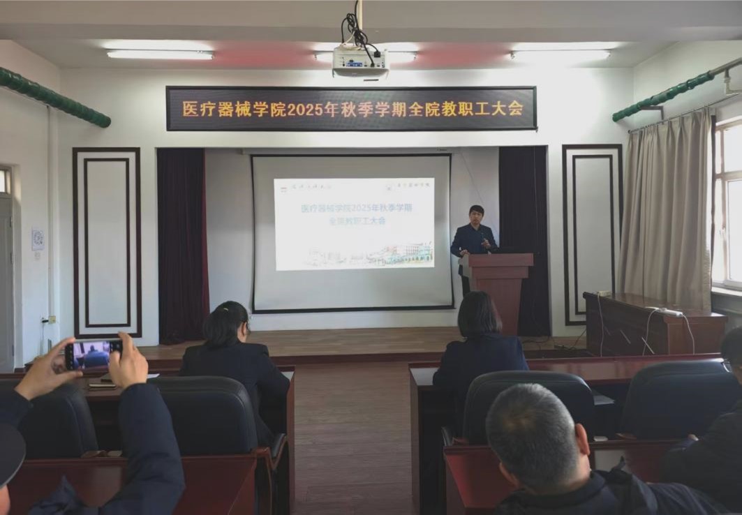 11月3日,医疗器械学院召开2025年秋季学期全院教职工大会,旨在统筹推进学院各项重点工作,明确下一阶段发展任务。学院领导班子及全体教职工参会,会议由副院长(主持工作)崔勇主持。