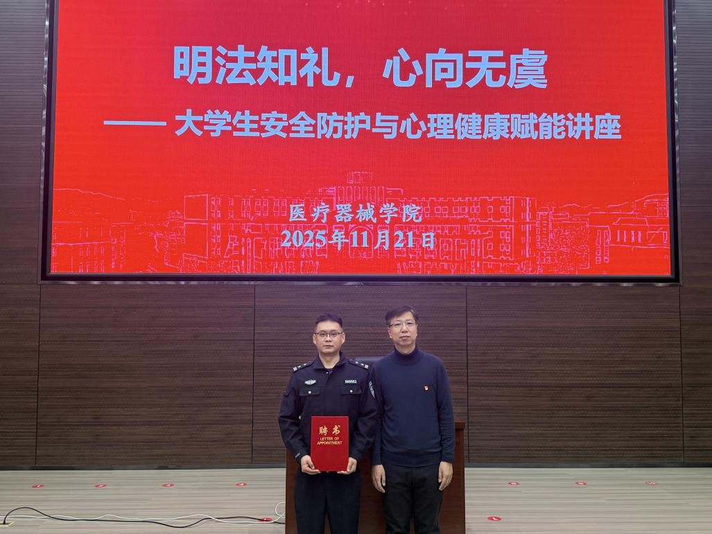 讲座现场还举行了隆重的聘任仪式。学院副院长赵勇山代表学院,正式聘任李举所长为 “医疗器械学院普法安全教育校外辅导员”,聘书的递交不仅是一份荣誉,更标志着校警合作在安全教育领域的深化升级,为学院安全育人工作注入专业力量。