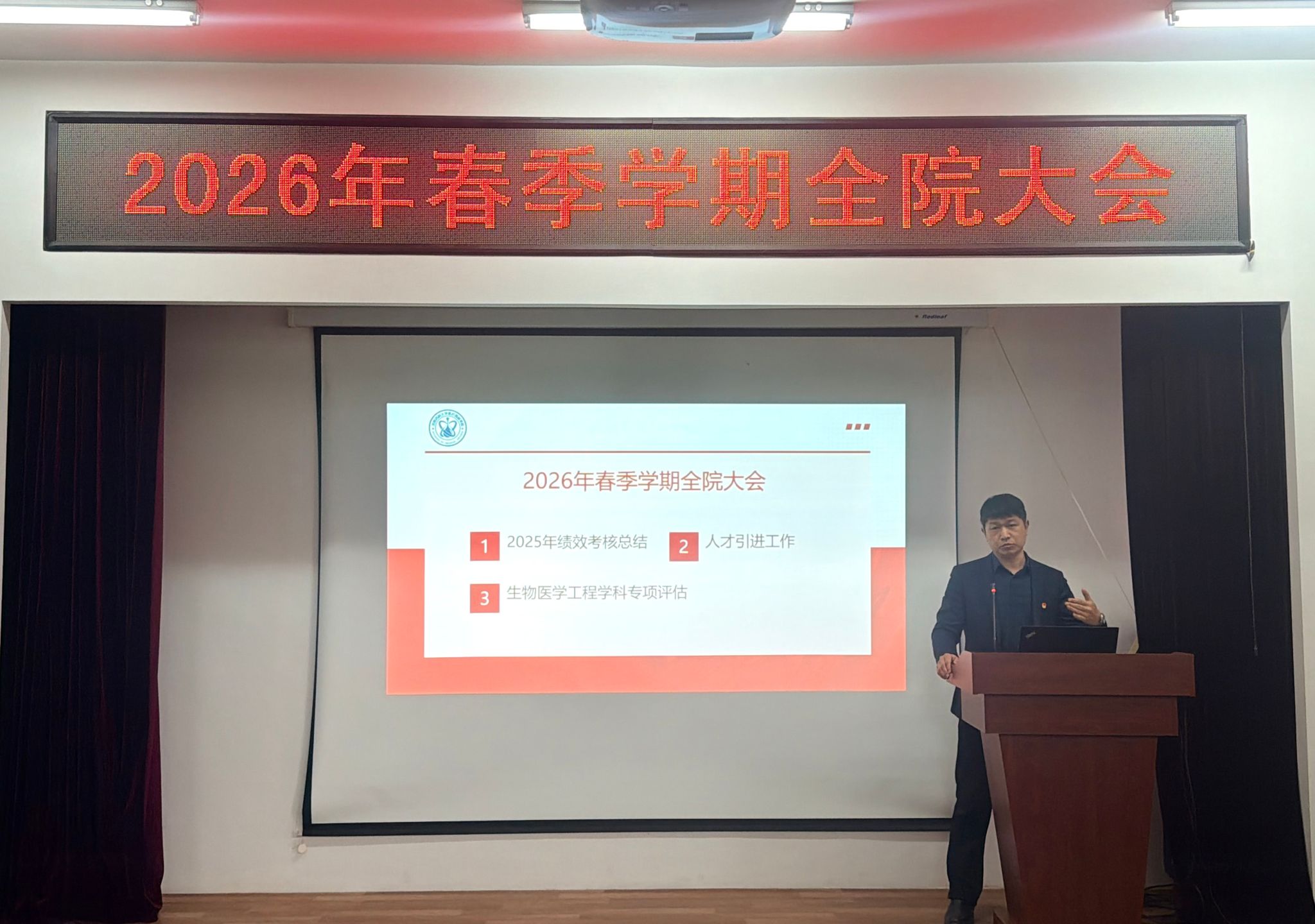 3月1日,在学院四楼大会议室召开2026年春季学期全院大会。会上,崔勇副院长(主持工作)结合详实数据,全面总结2025年度绩效考核工作,肯定学院在教学、科研、学生管理服务等方面的成效,明确未来重点突破方向。会议还就生物医学工程学科专项评估,围绕特色凝练、指标落实等关键环节作出具体部署;在人才工作上,强调“引育并举”,既要加大海内外高层次领军人才引进力度,也要优化青年教师培养体系;在科研领域,聚焦国家重大战略需求,力争高水平项目和成果产出实现新突破。此外,会议重点部署安全生产相关事宜,要求全体教工绷紧安全弦,保障教学科研心理等全领域环境安全稳定。